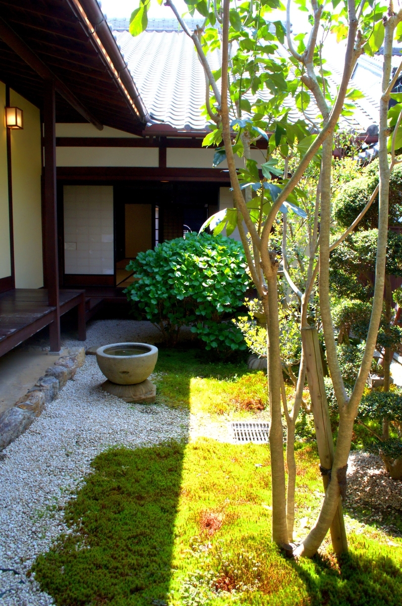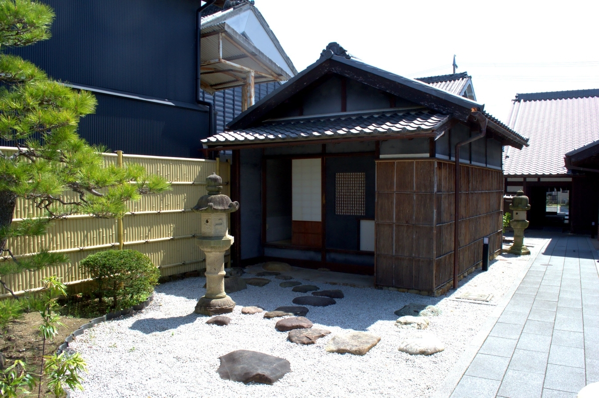 茶室は明治末期から大正期頃に建設されています*5。保存修理工事報告書によると茶道の趣味を持っていた九代目当主が普請したものと考えられ、賣茶流を反映しているためか草庵風茶室とは異なる趣になっています*6。茶室廻りで用いられている踏み石や石灯篭は現存していたものを可能な限り残しながら活用しています*7。
