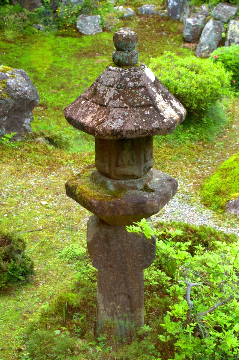 庭園の一角には織部灯篭があります。この織部灯篭、竿に字形無く彫像のみ、中台は灯篭の笠を逆にした六角形のもの。中央部には作り出しがあり、その上に六角の火袋があって、各面に地蔵尊が彫られています。笠は蓮華寺風と柚木形の折衷のような形態となっているなど、各部位が寄せ集めで構成されていますが、破綻なくまとまっています。