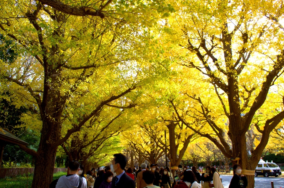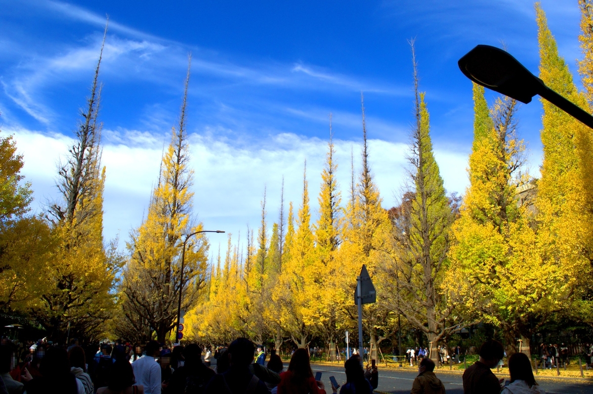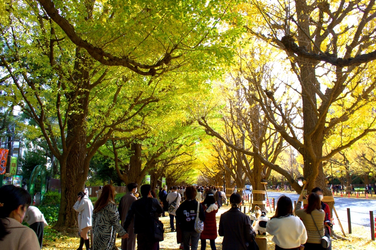東京都区内でも有数の秋の名所である、明治神宮外苑のいちょう並木。大正12年(1923)に整備された並木道で、遠近法を活用しながら聖徳記念絵画館が中央にみえるように設計されています。