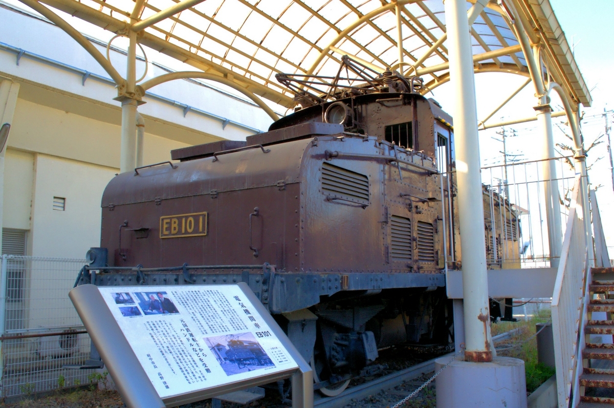 国鉄EB10形電気機関車は、昭和2年(1927)に芝浦製作所(現・東芝)等が2両製造した機関車です。当初は国鉄唯一の蓄電池機関車として製造されましたが、昭和6年(1931)に電気機関車に改造されパンタグラフが屋根に設置され、昭和46年(1971)まで貨物輸送で活躍しました。