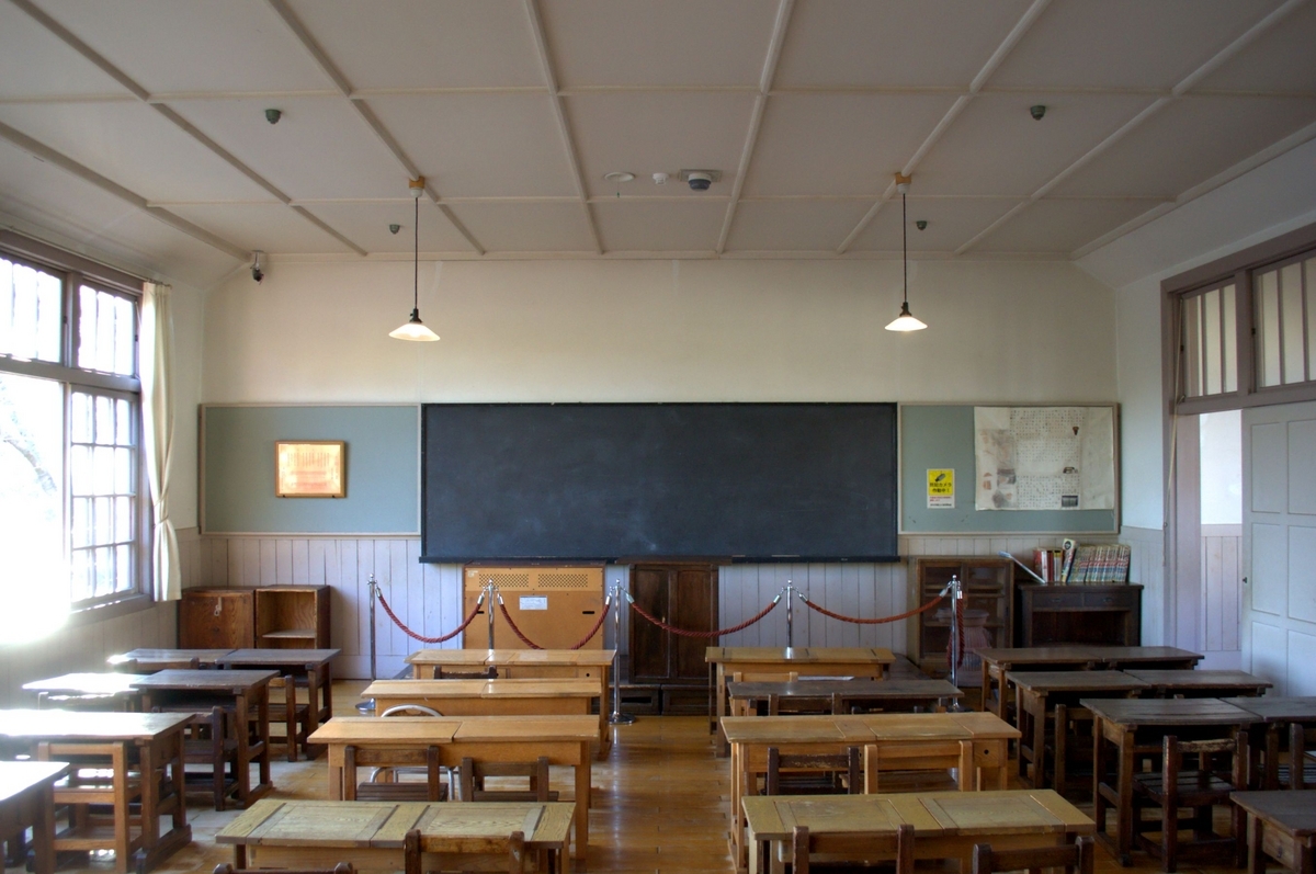 旧府中尋常高等小学校校舎は、昭和10年(1935)に現在の府中市寿町に建設された建築です。昭和54年(1979)まで使用されました。郷土の森博物館に移築されたのは、校舎の中の中心的な部分のみですが、当時の小学校の雰囲気がよくわかります*1。
