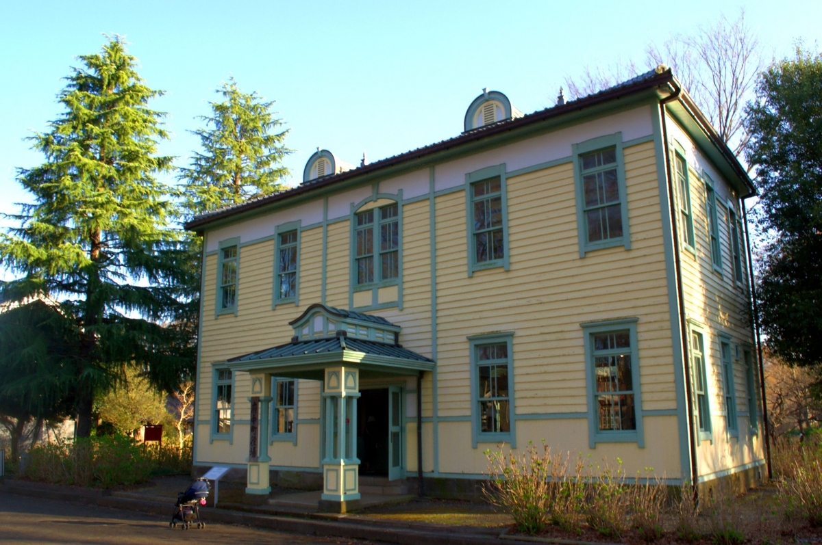 旧府中町役場庁舎は、大正10年(1921)に現在の府中市宮西町に建設された建築です。府中町の町役場として建築され、周辺町村の合併により誕生した府中市の初代庁舎としても使用された後、市立図書館、教育研究所として活用されました。昭和61年(1986)に現在地へ移築保存されています*2。「大正デモクラシー」の言葉で形容される大正時代のよき雰囲気が伝わってくるような建築です。それにしても、当時の町役場って小さかったのですね。