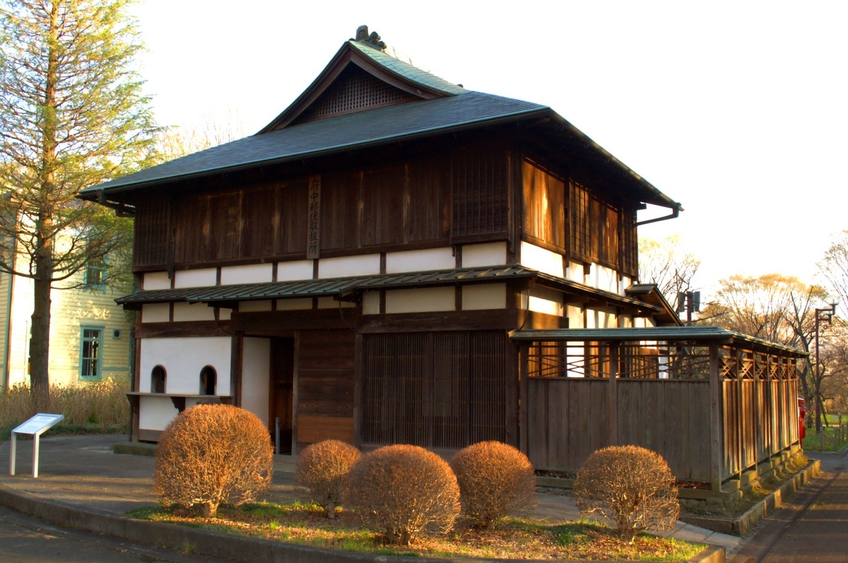 旧府中郵便取扱所(旧矢島家住宅)は、幕末~明治時代初期頃に建てられた住宅です。明治5年(1872)に当時の矢島家当主である矢島九兵衛が郵便取扱役に任命されたことから、自身の住宅を郵便取扱所としました。その後、歯科医院として洋風に改築されたりしましたが、平成元年(1989)までに郵便取扱所時代に移築復元されました*3。郵便制度の最初期にあたる建築で、どちらかというと住宅兼郵便局の性格が強い貴重な遺構です。