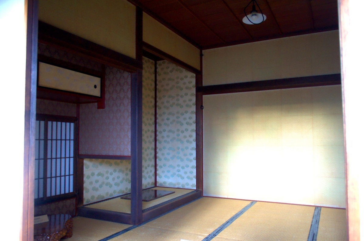 旧田中家住宅は、江戸時代後期から明治時代にかけての府中を代表する商家です。明治天皇が兎狩りや鮎漁見物でこの地域へ行幸される際、行在所としても用いられ、昭和8年(1933)「明治天皇府中行在所」として国の史蹟(明治天皇聖蹟)に指定されていました。昭和15年(1940)に府中町の町有財産になりますが、戦後に史蹟指定が解除され、老朽化した建物などが徐々に取り壊されていき、御座所だけが残されます。その後、御座所の長期保存を望む声や、江戸時代の大店の雰囲気を再現できることから、平成元年(1989)に移築復元されました。失われた建築や庭等は宮内庁に残されていた屋敷図面や写真資料などを基に復原されています*5。明治天皇聖蹟の一つですが、各地に残されている御座所と比較してもそこまで豪華な印象はありません。それがかえって居心地の良い場所として複数回使用されたのかもしれませんね。