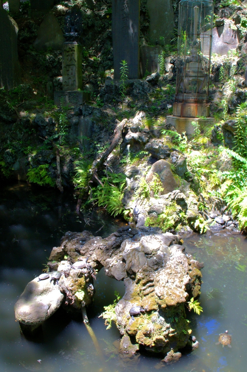 亀島は、仁王池の右方にある亀の形をした中島です。いかにも古そうな雰囲気を持つ石で構成されています。